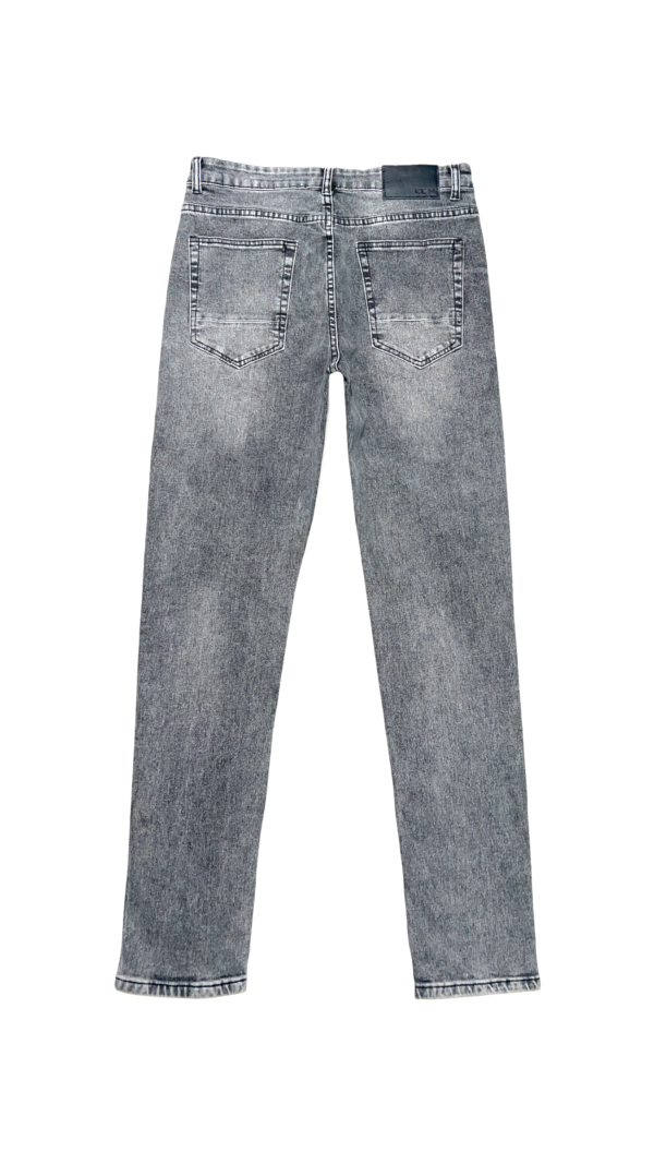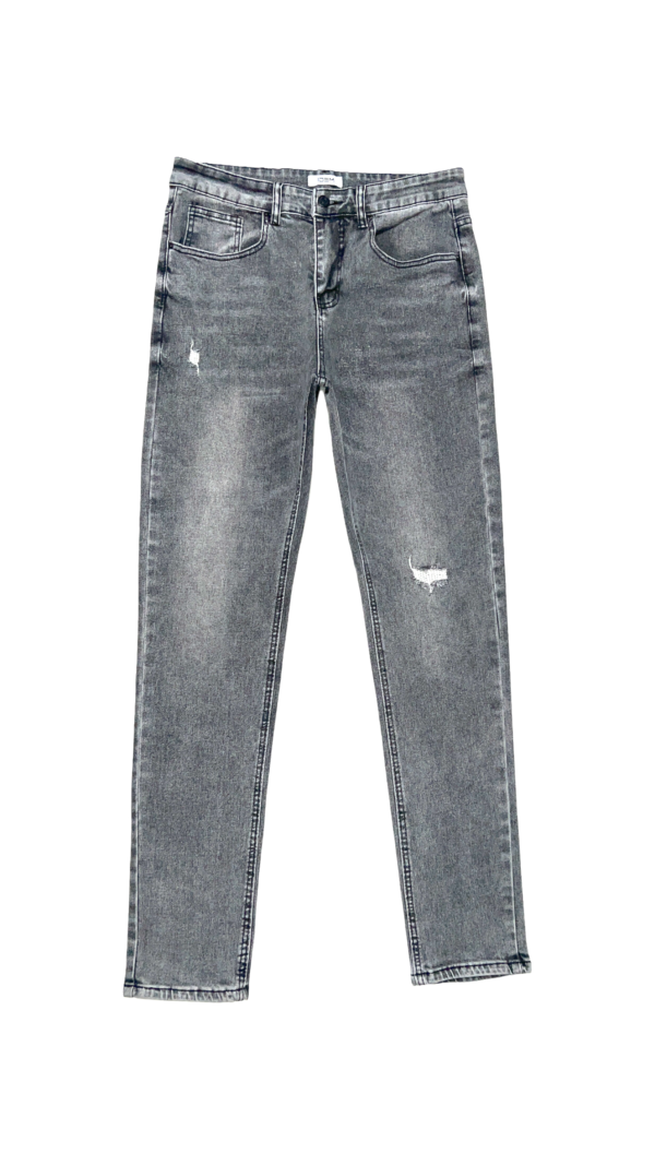 Es un jeans de 5 bolsillos con lavado de tono gris y focalizado suave, efecto de distroyer parchado con costuras.